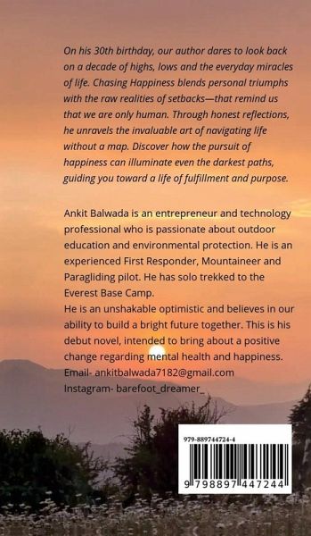 On his 30th birthday, our author "Mr. Ankit Balwada" dares to look back on a decade of highs, lows and the everyday miracles of life. Chasing Happiness is a candid memoir that blends personal triumphs with the raw realities of setbacks-from the thrill of career breakthroughs and the joy of deep connections to the inevitable stumbles that remind us that we are only human. Through honest reflections and real-life anecdotes, you will journey alongside a young man determined to embrace every moment of his transformative twenties. With friendships that anchor him and challenges that push him to grow, he unravels the art of navigating life without a map. This book is all about the invaluable life lessons learned in the valleys of doubt and disappointment. Discover how the pursuit of happiness can illuminate even the darkest paths, guiding you toward a life of fulfillment and purpose.