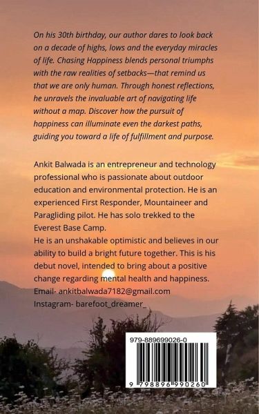 On his 30th birthday, our author "Mr. Ankit Balwada" dares to look back on a decade of highs, lows and the everyday miracles of life. Chasing Happiness is a candid memoir that blends personal triumphs with the raw realities of setbacks-from the thrill of career breakthroughs and the joy of deep connections to the inevitable stumbles that remind us that we are only human. Through honest reflections and real-life anecdotes, you will journey alongside a young man determined to embrace every moment of his transformative twenties. With friendships that anchor him and challenges that push him to grow, he unravels the art of navigating life without a map. This book is all about the invaluable life lessons learned in the valleys of doubt and disappointment. Discover how the pursuit of happiness can illuminate even the darkest paths, guiding you toward a life of fulfillment and purpose.