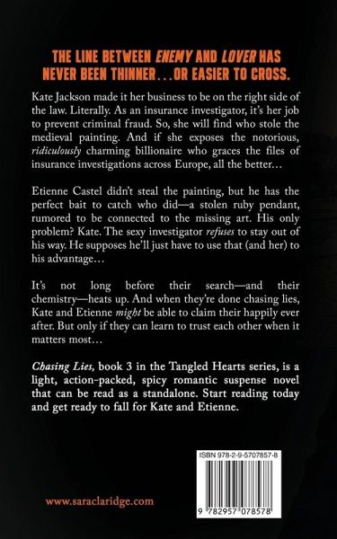 Kate Jackson had never been on the wrong side of the law... Until the day she met Etienne Castel. The billionaire whose face graces the cover of celebrity gossip magazines, while his nefarious activities fill the files of insurance investigations, is top of her list of suspects in the theft of a medieval painting. But Etienne is just as keen to get his hands on the stolen artwork as Kate. And he's not above using the sexy brunette to get his way. He already has the perfect lure-a ruby pendant, listed as stolen and rumoured to be connected to the painting. Certain that she can't trust a word the unscrupulous Etienne says, no matter how intoxicating his kisses are, Kate follows him back into a world from which she'd vowed never to return. And into a deadly game of intrigue, deceit, and treachery. Set across the darker side of Europe, Chasing Lies is an action-packed, suspenseful romance featuring a sinfully sexy hero, a stolen painting, and a priceless treasure.
