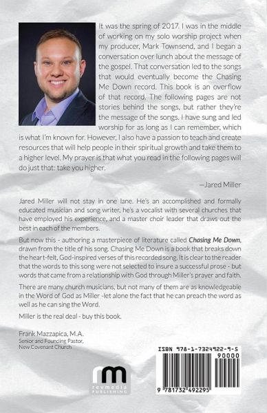 Chasing Me Down is a book that beaks down the heart-felt, God-inspired verses of this recorded song. It is clear to the reader that the words to this song were not selected to insure a successful prose - but words that came from a relationship with God through Miller's prayer and faith. There are many church musicians, but not many of them are as knowledgeable in the Word of God as Miller -let alone the fact that he can preach the word as well as he can sing the Word. Miller is the real deal - buy this book. Frank Mazzapica, M.A. Senior and Founding Pastor, New Covenant Church