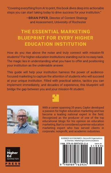 "Covering everything from AI to print, this book dives deep into actionable steps you can start taking today to drive success for your institution." -Brian Piper, Director of Content Strategy and Assessment, University of Rochester THE ESSENTIAL MARKETING BLUEPRINT FOR EVERY HIGHER EDUCATION INSTITUTION How do you rise above the noise and truly connect with mission-fit students? For higher education institutions standing out is no easy task. The magic lies in understanding what you have to offer and positioning your institution as the undeniable answer. This guide will help your institution harness the power of audience-focused marketing to capture the attention of students who will succeed at your unique institution. Filled with practical advice, tactics you can implement immediately, and decades of experience, this blueprint will bridge the gap between you and your mission-fit student.