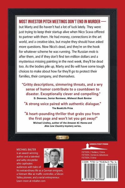 Winner - 2023 Best Indie Book Award - Crime Thriller A missing masterpiece. A deadly threat. A desperate search. Marty and Bo were just trying to keep their struggling startup alive - but now they've got a bigger problem - keeping themselves alive. "Exceptionally clever and compelling" - Midwest Book Review "Packed with action. A strong voice paired with authentic dialogue... Witty and engaging." The BookLife Prize "A satisfying crime novel that will keep readers hooked." Kirkus Reviews Most investor pitch meetings don't end in murder - but then Marty and Bo haven't had a lot of luck lately. They've been struggling to keep their startup business alive. It's not high-tech, it's not highly successful and the pressure to find capital has strained their bank accounts and Marty's marriage. So when Nico Scava offered to invest they eagerly accepted. He had money, connections in the art world, and a creative idea, but maybe they should have asked more questions. Now Nico's dead and they're on the hook for whatever scheme he was running. The Russian mob is after them, and if they don't find $10 million and a mysterious missing painting in the next few days they'll be dead too. Their frantic chase will lead them from a cabin in the Oregon woods to a Portland strip club, from an aging artist to a bogus baron, and deep into the history of a missing masterpiece that someone is willing to kill to obtain. As the bodies pile up, Marty and Bo will have some tough choices to make about how far they'll go to protect their families, their company, and themselves. "A gritty, heart-pounding thriller that grabs you from the first page and won't let you get away!" - Michael Lindley, author of the Amazon #1 Hanna and Alex Low Country mystery series. "The DaVinci Code for grownups. Don't miss this impressive debut novel!" - Warren C. Easley, author of the award-winning Cal Claxton Mysteries.