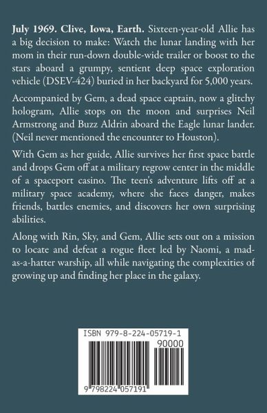 July 1969. Clive, Iowa, Earth. Sixteen-year-old Allie has a big decision to make: Watch the lunar landing with her mom in their run-down double-wide trailer or boost to the stars aboard a grumpy, sentient deep space exploration vehicle (DSEV-424) buried in her backyard for 5,000 years. Accompanied by Gem, a dead space captain, now a glitchy hologram, Allie stops on the moon and surprises Neil Armstrong and Buzz Aldrin aboard the Eagle lunar lander. (Neil never mentioned the encounter to Houston). With Gem as her guide, Allie survives her first space battle and drops Gem off at a military regrow center in the middle of a spaceport casino. The teen's adventure lifts off at a military space academy, where she faces danger, makes friends, battles enemies, and discovers her own surprising abilities. Along with Rin, Sky, and Gem, Allie sets out on a mission to locate and defeat a rogue fleet led by Naomi, a mad-as-a-hatter warship, all while navigating the complexities of growing up and finding her place in the galaxy.