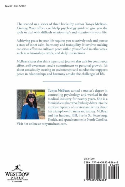 The second in a series of three books by author Tonya McBean, Chasing Peace offers a self-help psychology guide to give you the tools to deal with difficult relationship's and situations in your life. Achieving peace in your life requires you to actively seek and pursue a state of inner calm, harmony, and tranquility. It involves making conscious efforts to cultivate peace within yourself and in other areas, such as relationships, work, and daily interactions. McBean shares that this is a personal journey that calls for continuous effort, self-awareness, and a commitment to personal growth. It's about consciously creating an environment and mindset that supports peace in relationships and harmony amidst the challenges of life.