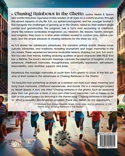 Embark on a Vibrant Journey of Childhood Adventures and Nostalgia: Where Rainbows Paint Memories Step into the vibrant world of Chasing Rainbows in the Ghetto, a captivating tale that transcends generations. This enchanting narrative, suitable for readers of all ages, seamlessly blends childhood memories, cultural richness, and the universal joy of growing up. Author, Ifabukola Ogunseye tabi Nielah B Spears, known for her bestselling Up From the Mud: The Rebirthing of A Lotus, invites you on an immersive exploration of city life through the eyes of Tutt and her younger brother J-Ron. In this delightful story, the rainbow becomes a powerful symbol of joy, freedom, life, and resilience. Tutt's adventures in the Ghetto take you back to a time when children reveled in playground games, dance contests, and the sheer thrill of chasing rainbows for the pure joy of it. Tutt shares her coming-of-age journey in a cityscape rich with diversity, offering readers a glimpse into a melting pot of races, cultures, and traditions. This book is a celebration of shared experiences that resonate across cultures. From African American to Latino, Asian to Caucasian, Chasing Rainbows in the Ghetto speaks to anyone who has cherished childhood memories in the backdrop of urban life. It's a universal story of laughter, community, and self- discovery that transcends boundaries. Whether you're a parent looking to share a heartwarming tale with your children, a teenager reminiscing about the carefree days of youth, or an adult seeking a nostalgic journey, Chasing Rainbows in the Ghetto promises to capture your heart. Rediscover the magic of hopscotch, double dutch, and the simple joy of chasing rainbows in this uplifting and culturally rich narrative.