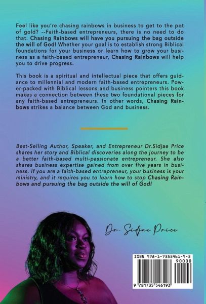 Feel like you're chasing rainbows in business to get to the pot of gold? Faith-based entrepreneurs, there is no need to do that. Chasing Rainbows will have you pursuing the bag outside the will of God! Whether your goal is to establish strong Biblical foundations for your business or learn how to grow your business as a faith-based entrepreneur, Chasing Rainbows will help you to drive progress. This book is a spiritual and intellectual piece that offers guidance to millennial and modern faith- based entrepreneurs. Power-packed with Biblical lessons and business pointers this book makes a connection between these two foundational pieces for any faith-based entrepreneurs. In other words, Chasing Rainbows strikes a balance between God and business. Best-Selling Author, Speaker, and Entrepreneur Dr.Sidjae Price shares her story and Biblical discoveries along the journey to be a better faith-based multi-passionate entrepreneur. She also shares business expertise gained from over five years in business. If you are a faith-based entrepreneur, your business is your ministry, and it requires you to learn how to stop Chasing Rainbows and pursuing the bag outside the will of God!