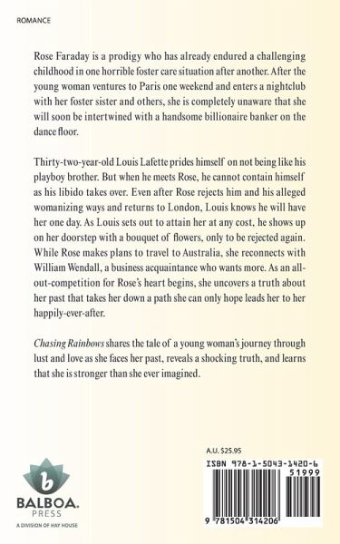 Rose Faraday is a prodigy who has already endured a challenging childhood in one horrible foster care situation after another. After the young woman ventures to Paris one weekend and enters a nightclub with her foster sister and others, she is completely unaware that she will soon be intertwined with a handsome billionaire banker on the dance floor. Thirty-two-year-old Louis Lafette prides himself on not being like his playboy brother. But when he meets Rose, he cannot contain himself as his libido takes over. Even after Rose rejects him and his alleged womanizing ways and returns to London, Louis knows he will have her one day. As Louis sets out to attain her at any cost, he shows up on her doorstep with a bouquet of flowers, only to be rejected again. While Rose makes plans to travel to Australia, she reconnects with William Wendall, a business acquaintance who wants more. As an all-out-competition for Roses heart begins, she uncovers a truth about her past that takes her down a path she can only hope leads her to her happily-ever-after. Chasing Rainbows shares the tale of a young womans journey through lust and love as she faces her past, reveals a shocking truth, and learns that she is stronger than she ever imagined.