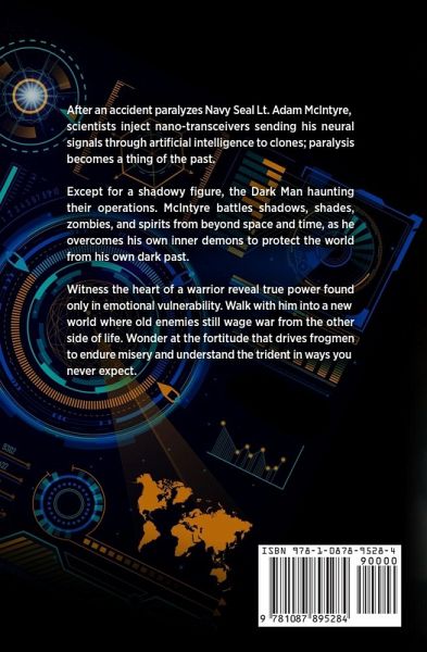 After an accident paralyzes Navy Seal Lt. Adam McIntyre, scientists inject nano-transceivers sending his neural signals through artificial intelligence to clones; paralysis becomes a thing of the past. Except for a shadowy figure, the Dark Man haunting their operations. McIntyre battles shadows, shades, zombies, and spirits from beyond space and time, as he overcomes his own inner demons to protect the world from his own dark past. Witness the heart of a warrior reveal true power found only in emotional vulnerability. Walk with him into a new world where old enemies still wage war from the other side of life. Wonder at the fortitude that drives frogmen to endure misery and understand the trident in ways you never expect.