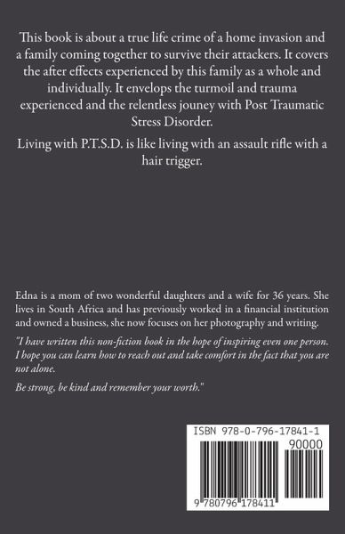 This book is about a true life crime of a home invasion and a family coming together to survive their attackers. It covers the after effects experienced by this family as a whole and individually. It envelops the turmoil and trauma experienced and the relentless jouney with Post Traumatic Stress Disorder.