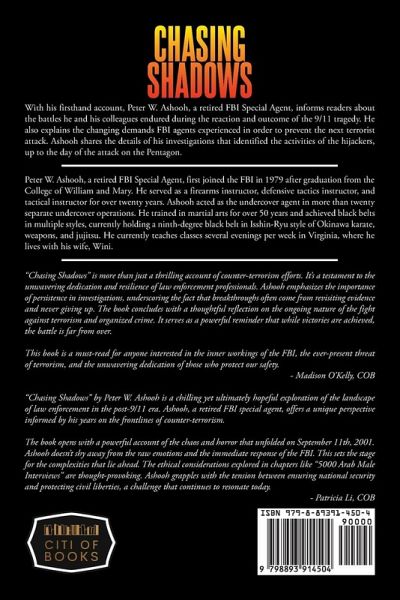 "Chasing Shadows" is more than just a thrilling account of counter-terrorism efforts. It's a testament to the unwavering dedication and resilience of law enforcement professionals. Ashooh emphasizes the importance of persistence in investigations, underscoring the fact that breakthroughs often come from revisiting evidence and never giving up. The book concludes with a thoughtful reflection on the ongoing nature of the fight against terrorism and organized crime. It serves as a powerful reminder that while victories are achieved, the battle is far from over. This book is a must-read for anyone interested in the inner workings of the FBI, the ever-present threat of terrorism, and the unwavering dedication of those who protect our safety. "Chasing Shadows" by Peter W. Ashooh is a chilling yet ultimately hopeful exploration of the landscape of law enforcement in the post-9/11 era. Ashooh, a retired FBI special agent, offers a unique perspective informed by his years on the frontlines of counter-terrorism. The book opens with a powerful account of the chaos and horror that unfolded on September 11th, 2001. Ashooh doesn't shy away from the raw emotions and the immediate response of the FBI. This sets the stage for the complexities that lie ahead. The ethical considerations explored in chapters like "5000 Arab Male Interviews" are thought-provoking. Ashooh grapples with the tension between ensuring national security and protecting civil liberties, a challenge that continues to resonate today.