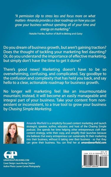 If you want your business to grow, effective marketing is crucial. But that doesn't mean you have to spend a ton of time on your marketing - even if you're a solopreneur. Do you dream of business growth, but aren't gaining traction? Does the thought of tackling your marketing feel daunting? Or, do you understand the importance of effective marketing, but simply don't have the time to get it done? There's good news! Marketing doesn't have to be so overwhelming, confusing, and complicated. Say goodbye to the confusion and complexity that has held you back, and say hello to a clear, actionable roadmap for business growth. In this transformative book, author Amanda Warfield takes you on a journey to demystify marketing with simplicity as your guiding principle. You'll walk away with a clear, concise, and personalized marketing strategy designed specifically for your entrepreneurial journey. You don't need a Masters of Business Administration (MBA) or a background in business to tackle your marketing head-on thanks to the strategies and techniques in this book that deliver real results. No longer will marketing feel like an insurmountable mountain; instead, it will become an easily manageable and integral part of your business. Take your content from non-existent or inconsistent, to a true tool to grow your business by Chasing Simple Marketing.