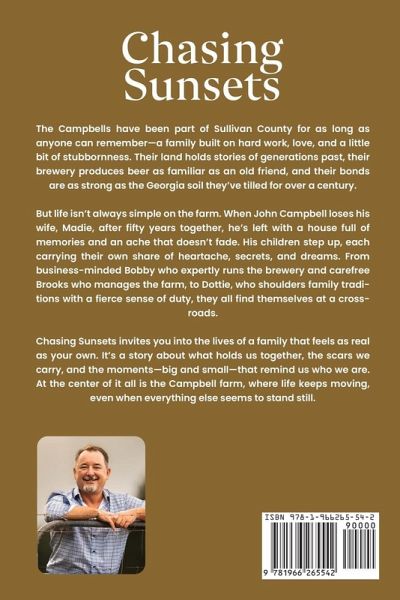 The Campbells have been part of Sullivan County for as long as anyone can remember-a family built on hard work, love, and a little bit of stubbornness. Their land holds stories of generations past, their brewery produces beer as familiar as an old friend, and their bonds are as strong as the Georgia soil they've tilled for over a century. But life isn't always simple on the farm. When John Campbell loses his wife, Madie, after fifty years together, he's left with a house full of memories and an ache that doesn't fade. His children step up, each carrying their own share of heartache, secrets, and dreams. From business-minded Bobby who expertly runs the brewery and carefree Brooks who manages the farm, to Dottie, who shoulders family traditions with a fierce sense of duty, they all find themselves at a crossroads. Chasing Sunsets invites you into the lives of a family that feels as real as your own. It's a story about what holds us together, the scars we carry, and the moments-big and small-that remind us who we are. At the center of it all is the Campbell farm, where life keeps moving, even when everything else seems to stand still.