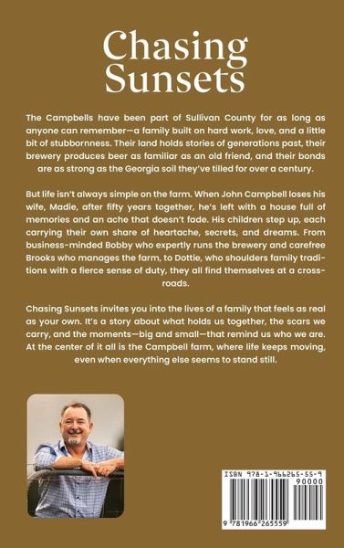 The Campbells have been part of Sullivan County for as long as anyone can remember-a family built on hard work, love, and a little bit of stubbornness. Their land holds stories of generations past, their brewery produces beer as familiar as an old friend, and their bonds are as strong as the Georgia soil they've tilled for over a century. But life isn't always simple on the farm. When John Campbell loses his wife, Madie, after fifty years together, he's left with a house full of memories and an ache that doesn't fade. His children step up, each carrying their own share of heartache, secrets, and dreams. From business-minded Bobby who expertly runs the brewery and carefree Brooks who manages the farm, to Dottie, who shoulders family traditions with a fierce sense of duty, they all find themselves at a crossroads. Chasing Sunsets invites you into the lives of a family that feels as real as your own. It's a story about what holds us together, the scars we carry, and the moments-big and small-that remind us who we are. At the center of it all is the Campbell farm, where life keeps moving, even when everything else seems to stand still.