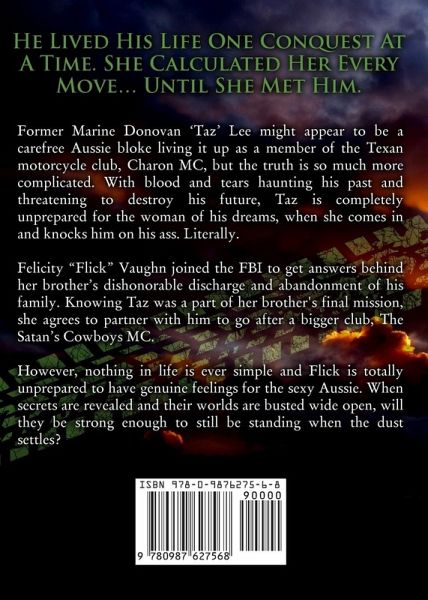 The dramatic conclusion to the Charon MC Trilogy is here… He lived his life one conquest at a time. She calculated her every move… until she met him. Former Marine Donovan 'Taz' Lee might appear to be a carefree Aussie bloke living it up as a member of the Texan motorcycle club, Charon MC, but the truth is so much more complicated. With blood and tears haunting his past and threatening to destroy his future, Taz is completely unprepared for the woman of his dreams, when she comes in and knocks him on his ass. Literally. Felicity "Flick" Vaughn joined the FBI to get answers behind her brother's dishonorable discharge and abandonment of his family. Knowing Taz was a part of her brother's final mission, she agrees to partner with him to go after a bigger club, The Satan's Cowboys MC. However, nothing in life is ever simple and Flick is totally unprepared to have genuine feelings for the sexy Aussie. When secrets are revealed and their worlds are busted wide open, will they be strong enough to still be standing when the dust settles?