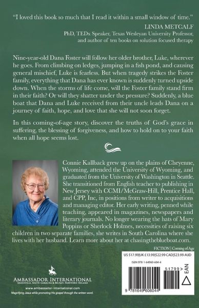 Nine-year-old Dana Foster will follow her older brother, Luke, wherever he goes. From climbing on ledges, jumping in a fish pond, and causing general mischief, Luke is fearless. But when tragedy strikes the Foster family, everything that Dana has ever known is suddenly turned upside down. When the storms of life come, will the Foster family stand firm in their faith? Or will they shatter under the pressure? Suddenly, a blue boat that Dana and Luke received from their uncle leads Dana on a journey of faith, hope, and love that she will not soon forget. In this coming-of-age story, discover the truths of God's grace in suffering, the blessing of forgiveness, and how to hold on to your faith when all hope seems lost. Praise for Chasing the Blue Boat I loved this book so much that I read it within a small window of time. The descriptions blew me away by bringing every detail to life. The author, gifted in storytelling, has created a tale with characters who will keep you wiping tears in one chapter and cheering their courage in another. Linda Metcalf PhD, TEDx Speaker, Texas Wesleyan University Professor, and author of ten books on solution focused therapy Connie Kallback put her compassion and skills to work in writing Chasing the Blue Boat to tap into emotions ranging from grief to love. A faith-centered novel, it is a rich nugget of literary enjoyment with authentic characters, symbolism, and foreshadowing well worth your time. George Watson Author of three Prentice Hall books for teachers, author with his wife Kathy of Positive and Courageous: 100 Daily Pillars for a Man's Soul and Authentic and Courageous: 100 Daily Boosts for a Woman's Soul, and Share a Prayer, a weekly devotional blog Chasing the Blue Boat wastes no time in pulling you into the story's vortex using people, places, and events that stir your emotions. In this way, Connie's novel grabs you early, makes you care, then leads you down a path you can't wait to take. From tragedy to triumph, this story told through the eyes of a young girl, is a classic in the making. Jerry Vallotton Author of The Toss: A New Offensive Attack for High-Scoring Football, serves in Little Country Church, Redding, California, as elder, youth leader, and on-loan speaker/preacher