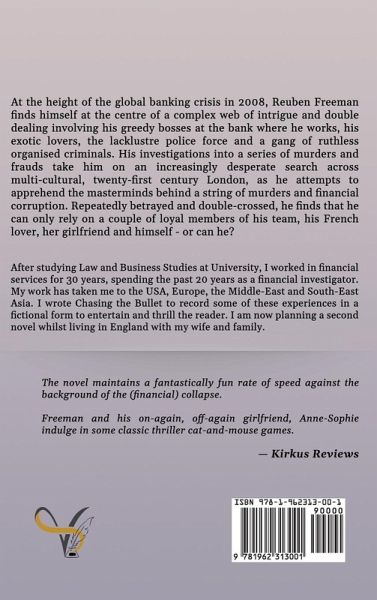 At the height of the global banking crisis in 2008, Reuben Freeman finds himself at the centre of a complex web of intrigue and double dealing involving his greedy bosses at the bank where he works, his exotic lovers, the lacklustre police force and a gang of ruthless organised criminals. His investigations into a series of murders and frauds take him on an increasingly desperate search across multi-cultural, twenty-first century London, as he attempts to apprehend the masterminds behind a string of murders and financial corruption. Repeatedly betrayed and double-crossed, he finds that he can only rely on a couple of loyal members of his team, his French lover, her girlfriend and himself - or can he? After studying Law and Business Studies at University, I worked in financial services for 30 years, spending the past 20 years as a financial investigator. My work has taken me to the USA, Europe, the Middle-East and South-East Asia. I wrote Chasing the Bullet to record some of these experiences in a fictional form to entertain and thrill the reader. I am now planning a second novel whilst living in England with my wife and family. The novel maintains a fantastically fun rate of speed against the background of the (financial) collapse. Freeman and his on-again, off-again girlfriend, Anne-Sophie indulge in some classic thriller cat-and-mouse games.