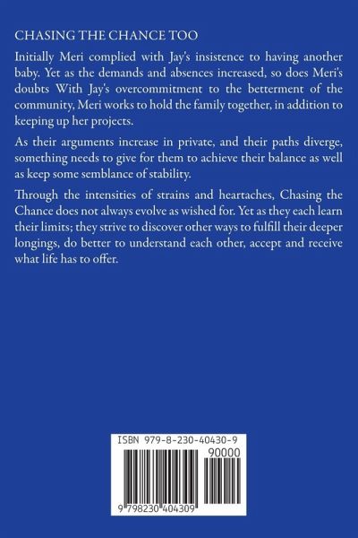 CHASING THE CHANCE TOO Initially Meri complied with Jay's insistence to having another baby. Yet as the demands and absences increased, so does Meri's doubts With Jay's overcommitment to the betterment of the community, Meri works to hold the family together, in addition to keeping up her projects. As their arguments increase in private, and their paths diverge, something needs to give for them to achieve their balance as well as keep some semblance of stability. Through the intensities of strains and heartaches, Chasing the Chance does not always evolve as wished for. Yet as they each learn their limits; they strive to discover other ways to fulfill their deeper longings, do better to understand each other, accept and receive what life has to offer.