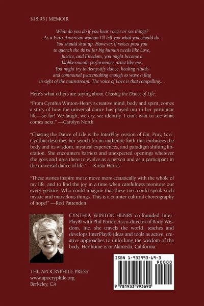 What do you do if you hear voices or see things? As a Euro-American woman I'll tell you what you should do. You should shut up. However, if voices prod you to quench the thirst for big human needs like Love, Justice, and Freedom, you might become a blabbermouth performance artist like me. You might try to demystify dance, healing rituals and communal peacemaking enough to wave a flag in sight of the mainstream. The voice of Love is that compelling.... Here's what others are saying about Chasing the Dance of Life: "From Cynthia Winton-Henry's creative mind, body and spirit, comes a story of how the universal dance has played out in her particular life-so far! We laugh, we cry, we identify. I can't wait to see what comes next." -Carolyn North "Chasing the Dance of Life is the InterPlay version of Eat, Pray, Love. Cynthia describes her search for an authentic faith that embraces the body and its wisdom, mystical experiences, and paradigm shifting liberation. She encounters barriers and unexpected openings wherever she goes and uses these to evolve as a person and as a participant in the universal dance of life." -Krista Harris "These stories inspire me to move more ecstatically with the whole of my life, and to find the joy in a time when carefulness monitors our every gesture. Who could imagine that these toes could speak such mystic and marvelous things. This is a counter cultural choreography of hope!" -Rod Pattenden