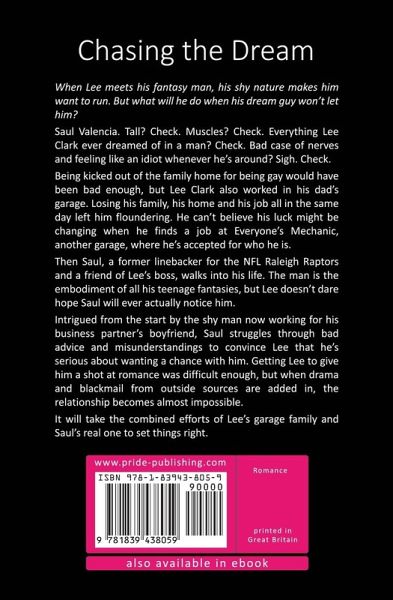 When Lee meets his fantasy man, his shy nature makes him want to run. But what will he do when his dream guy won't let him? Saul Valencia. Tall? Check. Muscles? Check. Everything Lee Clark ever dreamed of in a man? Check. Bad case of nerves and feeling like an idiot whenever he's around? Sigh. Check. Being kicked out of the family home for being gay would have been bad enough, but Lee Clark also worked in his dad's garage. Losing his family, his home and his job all in the same day left him floundering. He can't believe his luck might be changing when he finds a job at Everyone's Mechanic, another garage, where he's accepted for who he is. Then Saul, a former linebacker for the NFL Raleigh Raptors and a friend of Lee's boss, walks into his life. The man is the embodiment of all his teenage fantasies, but Lee doesn't dare hope Saul will ever actually notice him. Intrigued from the start by the shy man now working for his business partner's boyfriend, Saul struggles through bad advice and misunderstandings to convince Lee that he's serious about wanting a chance with him. Getting Lee to give him a shot at romance was difficult enough, but when drama and blackmail from outside sources are added in, the relationship becomes almost impossible. It will take the combined efforts of Lee's garage family and Saul's real one to set things right.