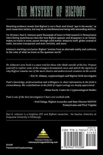 Mounting evidence reveals that Bigfoot is not a flesh-and-blood "ape in the woods," as most researchers believe, but may be an interdimensional being with astounding abilities. For 20 years, Paul G. Johnson spent thousands of hours in field research in Pennsylvania interviewing eyewitnesses describe how Bigfoot appears and disappears in an instant, makes no tracks in snow, passes through solid matter, teleports itself, glides instead of walks, becomes transparent and even invisible, and more. Johnson's startling conclusion: Bigfoot "evolves from an alternate reality and conforms to the rules of what we know as the quantum world.""