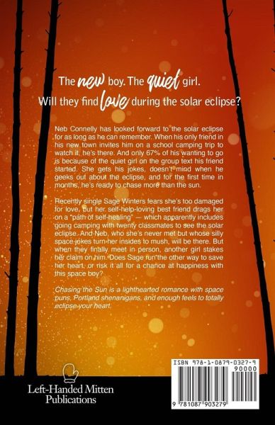 The new boy. The quiet girl. Will they find love during the solar eclipse? Neb Connelly has looked forward to the solar eclipse for as long as he can remember. When his only friend in his new town invites him on a school camping trip to watch it, he's there. And only 67% of his wanting to go is because of the quiet girl on the group text his friend started. She gets his jokes, doesn't mind when he geeks out about the eclipse, and for the first time in months, he's ready to chase more than the sun. Recently single Sage Winters fears she's too damaged for love, but her self-help-loving best friend drags her on a "path of self-healing" - which apparently includes going camping with twenty classmates to see the solar eclipse. And Neb, who she's never met but whose silly space jokes turn her insides to mush, will be there. But when they finally meet in person, another girl stakes her claim on him. Does Sage run the other way to save her heart, or risk it all for a chance at happiness with this space boy? Book one in the Campfire Series, Chasing the Sun, is a lighthearted romance with space puns, Portland shenanigans, and enough feels to totally eclipse your heart.
