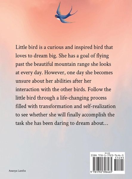 Little bird is a curious and inspired bird that loves to dream big. She has a goal of flying past the beautiful mountain range she looks at every day. However, one day she becomes unsure about her abilities after her interaction with the other birds. Follow the little bird through a life-changing process filled with transformation and self-realization to see whether she will finally accomplish the task she has been daring to dream about...