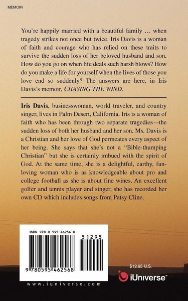 You're happily married with a beautiful family . when tragedy strikes not once but twice. Iris Davis is a woman of faith and courage who has relied on these traits to survive the sudden loss of her beloved husband and son. How do you go on when life deals such harsh blows? How do you make a life for yourself when the lives of those you love end so suddenly? The answers are here, in Iris Davis's memoir, CHASING THE WIND.
