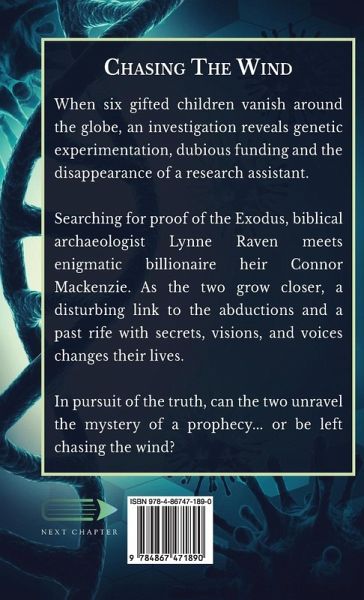 When six gifted children vanish around the globe, an investigation reveals genetic experimentation, dubious funding and the disappearance of a research assistant. Searching for proof of the Exodus, biblical archaeologist Lynne Raven meets enigmatic billionaire heir Connor Mackenzie. As the two grow closer, a disturbing link to the abductions and a past rife with secrets, visions, and voices changes their lives. In pursuit of the truth, can the two unravel the mystery of a prophecy... or be left chasing the wind?