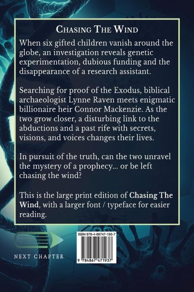 When six gifted children vanish around the globe, an investigation reveals genetic experimentation, dubious funding and the disappearance of a research assistant. Searching for proof of the Exodus, biblical archaeologist Lynne Raven meets enigmatic billionaire heir Connor Mackenzie. As the two grow closer, a disturbing link to the abductions and a past rife with secrets, visions, and voices changes their lives. In pursuit of the truth, can the two unravel the mystery of a prophecy... or be left chasing the wind? This is the large print edition of Chasing The Wind, with a larger font / typeface for easier reading.¿