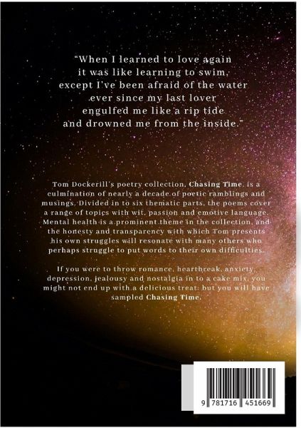Tom Dockerill's poetry collection, Chasing Time, is a culmination of nearly a decade of poetic ramblings and musings. Divided in to six thematic parts, the poems cover a range of topics with wit, passion and emotive language. Mental health is a prominent theme in the collection, and the honesty and transparency with which Tom presents his own struggles will resonate with many others who perhaps struggle to put words to their own difficulties. If you were to throw romance, heartbreak, anxiety, depression, jealousy and nostalgia in to a cake mix, you might not end up with a delicious treat: but you will have sampled Chasing Time.