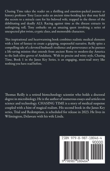 Chasing Time takes the reader on a thrilling and emotion-packed journey as history professor Tony Lucas seeks an ancient time-bending key that may hold the secrets to a miracle cure for his beloved wife, trapped in the throes of the debilitating and deadly ALS. Racing against time as the disease extracts its unforgiving toll, Tony embarks on an amazing quest involving a series of unexpected plot twists, cryptic clues, and memorable characters. This inspirational and heartwarming book combines realistic medical elements with a hint of fantasy to create a gripping, suspenseful narrative. Reilly spins a compelling tale of a devoted husband's resilience and perseverance as he pursues a life-saving mission that extends from ancient Rome to modern-day America to the lush olive groves of Andalusia. With its precise and witty style, Chasing Time, Book 1 in the Janus Key Series, is an engaging, must-read story like nothing you have read before.