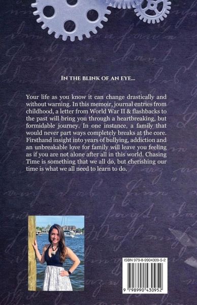 In the blink of an eye, your life as you know it can change drastically and without warning. In this memoir, journal entries from childhood, a letter from World War II & flashbacks to the past will bring you through a heartbreaking, but formidable journey. In one instance, a family that would never part ways completely breaks at the core. Firsthand insight into years of bullying, addiction and an unbreakable love for family will leave you feeling as if you are not alone after all in this world. Chasing Time is something that we all do, but cherishing our time is what we all need to learn to do.