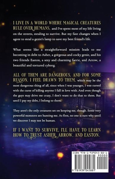 Over a decade ago, I was cursed by a genie so that I could never fall in love. If I break the curse, the creature or human I fall in love with will die a painful death. I've spent years fighting my emotions to protect the people in my life. But my fate changes when I make an agreement to steal a genie's lamp in order to save my friend's life. Let's just say I mess up the mission a bit and end up getting stuck with Asher, a gorgeous but arrogant genie, and his two friends Easton, a flirty faerie, and Arrow, a sweet cyborg, and his quiet, brooding brother, Maxton. I also discover I might be human. But no one seems to know what sort of creature I am. That's okay, though. I've made it my mission to find that out, even if I have to ask the guys for help. I just can't let myself fall for any of them or else we'll all end up dead. This is a full-length why choose/reverse harem fated mates series.
