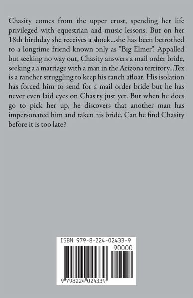 Chasity comes from the upper crust, spending her life privileged with equestrian and music lessons. But on her 18th birthday she receives a shock...she has been betrothed to a longtime friend known only as "Big Elmer". Appalled but seeking no way out, Chasity answers a mail order bride, seeking a a marriage with a man in the Arizona territory...Tex is a rancher struggling to keep his ranch afloat. His isolation has forced him to send for a mail order bride but he has never even laid eyes on Chasity just yet. But when he does go to pick her up, he discovers that another man has impersonated him and taken his bride. Can he find Chasity before it is too late?