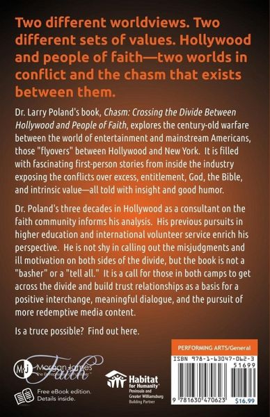 Two different world-views. Two different sets of values. Hollywood and people of faith—two worlds in conflict and the chasm that exists between them. Dr. Larry Poland's book, Chasm: Crossing the Divide Between Hollywood and People of Faith, explores the century-old warfare between the world of entertainment and mainstream Americans, those "flyovers" between Hollywood and New York. It is filled with fascinating first-person stories exposing the conflicts over excess, entitlement, God, the Bible, and intrinsic value. Dr. Poland's three decades in Hollywood as a consultant on the faith community informs his analysis. Stories from inside the industry are told with insight and good humor even amid some biting criticisms of those on both sides of the divide. Far from a "basher" or "tell all," Chasm is a call for those in both camps to get across the divide and build trust relationships as a basis for positive interchange, meaningful dialogue, and the pursuit of more redemptive media content. Is a truce possible? Find out here.