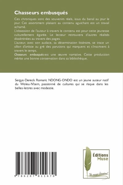 Ces chroniques sont des souvenirs réels, issus du banal au jour le jour. Cet assortiment plaisant au contenu aguichant est un travail acharné.L'obsession de l'auteur à travers le contenu est pour cette jeunesse culturellement égarée. Le lecteur retrouvera d'autres réalités disséminées au travers des pages.L'auteur, avec son audace, sa détermination littéraire, se trace un sillon d'artiste au gré des parutions qui marquent et s'inscrivent à travers le temps. Chasseurs embusqués est une oeuvre narrative. Cette production mérite une bonne conservation dans sa bibliothèque.