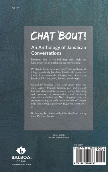 Chat 'Bout!: An Anthology of Jamaican Conversations Jamaicans love to 'tek bad tings mek laugh' and Chat 'Bout! lets you get in on the conversation. Written in Patwa or Patois, Chat 'Bout! celebrates all things mundanely Jamaican. Unfiltered, honest and funny, it examines the idiosyncrasies of everyday Jamaican life - the good, the bad, and the ugly. Guided by Jamaican GPS, Chat 'Bout! takes you on a journey through Jamaica, past and present. Get lost while reminiscing down memory lane; stop and eavesdrop on conversations, and vicariously experience a minibus ride. Next thing you know, you are experiencing an unfortunate episode of 'runnin' belly' and having a good belly laugh while you are at it. Be thoroughly entertained by Chat 'Bout! and pick up some Patwa as brawta.