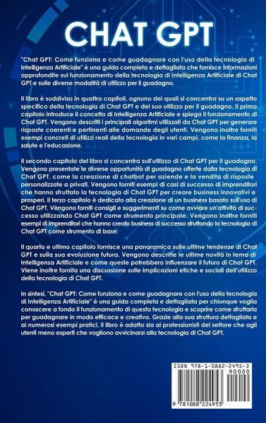 "Chat GPT: Come funziona e come guadagnare con l'uso della tecnologia di Intelligenza Artificiale" è una guida completa e dettagliata che fornisce informazioni approfondite sul funzionamento della tecnologia di Intelligenza Artificiale di Chat GPT e sulle diverse modalità di utilizzo per il guadagno. Il libro è suddiviso in quattro capitoli, ognuno dei quali si concentra su un aspetto specifico della tecnologia di Chat GPT e del suo utilizzo per il guadagno. Il primo capitolo introduce il concetto di Intelligenza Artificiale e spiega il funzionamento di Chat GPT. Vengono descritti i principali algoritmi utilizzati da Chat GPT per generare risposte coerenti e pertinenti alle domande degli utenti. Vengono inoltre forniti esempi concreti di utilizzi reali della tecnologia in vari campi, come la finanza, la salute e l'educazione. Il secondo capitolo del libro si concentra sull'utilizzo di Chat GPT per il guadagno. Vengono presentate le diverse opportunità di guadagno offerte dalla tecnologia di Chat GPT, come la creazione di chatbot per aziende e la vendita di risposte personalizzate a privati. Vengono forniti esempi di casi di successo di imprenditori che hanno sfruttato la tecnologia di Chat GPT per creare business innovativi e prosperi. Il terzo capitolo è dedicato alla creazione di un business basato sull'uso di Chat GPT. Vengono forniti consigli e suggerimenti su come avviare un'attività di successo utilizzando Chat GPT come strumento principale. Vengono inoltre forniti esempi di imprenditori che hanno creato business di successo sfruttando la tecnologia di Chat GPT come strumento di base. Il quarto e ultimo capitolo fornisce una panoramica sulle ultime tendenze di Chat GPT e sulla sua evoluzione futura. Vengono descritte le ultime novità in tema di Intelligenza Artificiale e come queste potrebbero influenzare il futuro di Chat GPT. Viene inoltre fornita una discussione sulle implicazioni etiche e sociali dell'utilizzo della tecnologia di Chat GPT. In sintesi, "Chat GPT: Come funziona e come guadagnare con l'uso della tecnologia di Intelligenza Artificiale" è una guida completa e dettagliata per chiunque voglia conoscere a fondo il funzionamento di questa tecnologia e scoprire come sfruttarla per guadagnare in modo efficace e creativo. Grazie alla sua struttura dettagliata e ai numerosi esempi pratici, il libro è adatto sia ai professionisti del settore che agli utenti meno esperti che vogliono avvicinarsi alla tecnologia di Chat GPT.