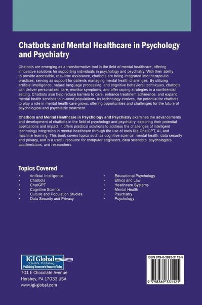 Chatbots are emerging as a transformative tool in the field of mental healthcare, offering innovative solutions for supporting individuals in psychology and psychiatry. With their ability to provide accessible, real-time assistance, chatbots are being integrated into therapeutic practices, serving as support for patients managing mental health challenges. By utilizing artificial intelligence, natural language processing, and cognitive behavioral techniques, chatbots can deliver personalized care, monitor symptoms, and offer coping strategies in a confidential setting. Chatbots also help reduce barriers to care, enhance treatment adherence, and expand mental health services to in-need populations. As technology evolves, the potential for chatbots to play a role in mental health care grows, offering opportunities and challenges for the future of psychological and psychiatric treatment. Chatbots and Mental Healthcare in Psychology and Psychiatry examines the advancements and development of chatbots in the field of psychology and psychiatry, exploring their potential applications and impact. It offers practical solutions to address the challenges of intelligent technology integration in mental healthcare through the use of tools like ChatGPT, AI, and machine learning. This book covers topics such as cognitive science, mental health, data security and privacy, and is a useful resource for computer engineers, data scientists, psychologists, academicians, and researchers.