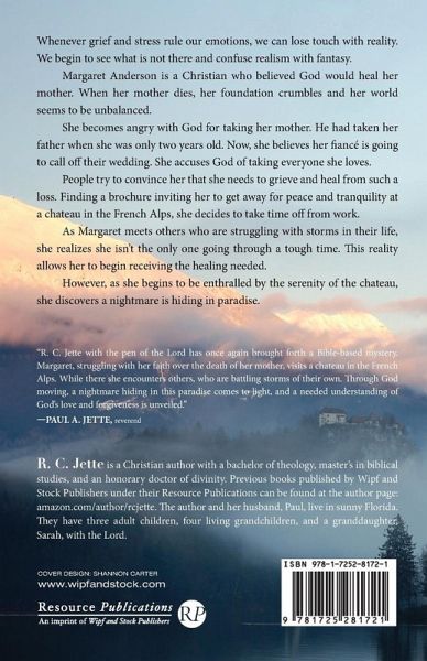 Whenever grief and stress rule our emotions, we can lose touch with reality. We begin to see what is not there and confuse realism with fantasy. Margaret Anderson is a Christian who believed God would heal her mother. When her mother dies, her foundation crumbles and her world seems to be unbalanced. She becomes angry with God for taking her mother. He had taken her father when she was only two years old. Now, she believes her fiance is going to call off their wedding. She accuses God of taking everyone she loves. People try to convince her that she needs to grieve and heal from such a loss. Finding a brochure inviting her to get away for peace and tranquility at a chateau in the French Alps, she decides to take time off from work. As Margaret meets others who are struggling with storms in their life, she realizes she isn't the only one going through a tough time. This reality allows her to begin receiving the healing needed. However, as she begins to be enthralled by the serenity of the chateau, she discovers a nightmare is hiding in paradise.