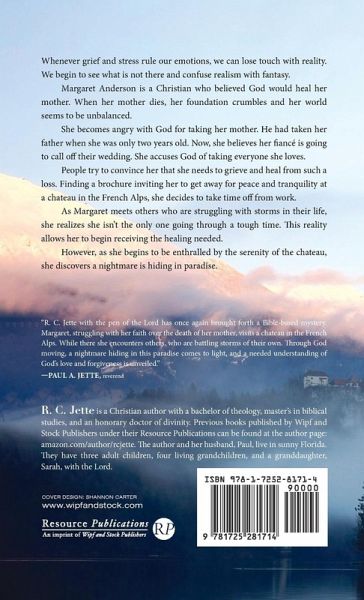 Whenever grief and stress rule our emotions, we can lose touch with reality. We begin to see what is not there and confuse realism with fantasy. Margaret Anderson is a Christian who believed God would heal her mother. When her mother dies, her foundation crumbles and her world seems to be unbalanced. She becomes angry with God for taking her mother. He had taken her father when she was only two years old. Now, she believes her fiance is going to call off their wedding. She accuses God of taking everyone she loves. People try to convince her that she needs to grieve and heal from such a loss. Finding a brochure inviting her to get away for peace and tranquility at a chateau in the French Alps, she decides to take time off from work. As Margaret meets others who are struggling with storms in their life, she realizes she isn't the only one going through a tough time. This reality allows her to begin receiving the healing needed. However, as she begins to be enthralled by the serenity of the chateau, she discovers a nightmare is hiding in paradise.