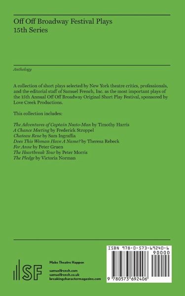A collection of short plays selected by New York theatre critics, professionals, and the editorial staff of Samuel French, Inc. as the most important plays of the 15th Annual Off Off Broadway Original Short Play Festival, sponsored by Love Creek Productions. This collection includes: The Adventures of Captain Neato-Man by Timothy Harris, A Chance Meeting by Frederick Stroppel, Chateau Rene by Sam Ingraffia, Does This Woman Have A Name? by Theresa Rebeck, For Anne by Peter Gruen, The Heartbreak T
