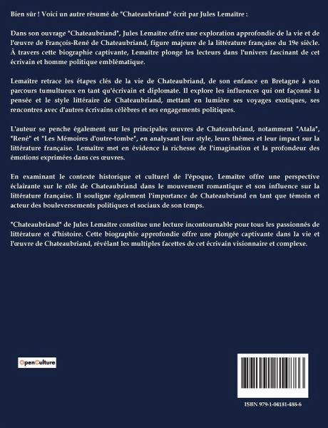 Bien sûr ! Voici un autre résumé de "Chateaubriand" écrit par Jules Lemaître : Dans son ouvrage "Chateaubriand", Jules Lemaître offre une exploration approfondie de la vie et de l'¿uvre de François-René de Chateaubriand, figure majeure de la littérature française du 19e siècle. À travers cette biographie captivante, Lemaître plonge les lecteurs dans l'univers fascinant de cet écrivain et homme politique emblématique. Lemaître retrace les étapes clés de la vie de Chateaubriand, de son enfance en Bretagne à son parcours tumultueux en tant qu'écrivain et diplomate. Il explore les influences qui ont façonné la pensée et le style littéraire de Chateaubriand, mettant en lumière ses voyages exotiques, ses rencontres avec d'autres écrivains célèbres et ses engagements politiques. L'auteur se penche également sur les principales ¿uvres de Chateaubriand, notamment "Atala", "René" et "Les Mémoires d'outre-tombe", en analysant leur style, leurs thèmes et leur impact sur la littérature française. Lemaître met en évidence la richesse de l'imagination et la profondeur des émotions exprimées dans ces ¿uvres. En examinant le contexte historique et culturel de l'époque, Lemaître offre une perspective éclairante sur le rôle de Chateaubriand dans le mouvement romantique et son influence sur la littérature française. Il souligne également l'importance de Chateaubriand en tant que témoin et acteur des bouleversements politiques et sociaux de son temps. "Chateaubriand" de Jules Lemaître constitue une lecture incontournable pour tous les passionnés de littérature et d'histoire. Cette biographie approfondie offre une plongée captivante dans la vie et l'¿uvre de Chateaubriand, révélant les multiples facettes de cet écrivain visionnaire et complexe.