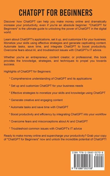 Discover how ChatGPT can help you make money online and dramatically increase your productivity, even if you're an absolute beginner. "ChatGPT for Beginners" is the ultimate guide to unlocking the power of ChatGPT in the digital world. Learn about ChatGPT's applications, set it up, and customize it for your business. Monetize your skills using effective strategies and generate captivating content. Automate tasks, save time, and integrate ChatGPT to boost productivity. Overcome fears about AI, and troubleshoot issues with ChatGPT's IT advice. Whether you're an entrepreneur, content creator, or professional, this book provides the knowledge, strategies, and techniques to propel you towards success. Highlights of ChatGPT for Beginners: * Comprehensive understanding of ChatGPT and its applications * Set up and customize ChatGPT for your business needs * Effective strategies to monetize your skills and knowledge using ChatGPT * Generate creative and engaging content * Automate tasks and save time with ChatGPT * Boost productivity and efficiency by integrating ChatGPT into your workflow * Overcome fears and misconceptions about AI and ChatGPT * Troubleshoot common issues with ChatGPT's IT advice Ready to make money online and supercharge your productivity? Grab your copy of "ChatGPT for Beginners" and unlock the incredible potential of ChatGPT!