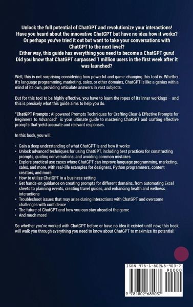 Unlock the full potential of ChatGPT and revolutionize your interactions! Have you heard about the innovative ChatGPT but have no idea how it works? Or perhaps you've tried it out but want to take your conversations with ChatGPT to the next level? Either way, this guide has everything you need to become a "ChatGPT" guru! Did you know that ChatGPT surpassed 1 million users in the first week after it was launched? Well, this is not surprising considering how powerful and game-changing this tool is. Whether it's language programming, marketing, sales, or other domains, ChatGPT is like a genius with a mind of its own, providing articulate answers in vast subjects. But for this tool to be highly effective, you have to learn the ropes of its inner workings - and this is precisely what this guide aims to help you do. ChatGPT Prompts is your ultimate guide to mastering ChatGPT and crafting effective prompts that yield accurate and relevant responses. In this book, you will: Gain a deep understanding of what ChatGPT is and how it works Unlock advanced techniques for using ChatGPT, including best practices for constructing prompts, guiding conversations, and avoiding common mistakes Explore practical use cases where ChatGPT can improve language programming, marketing, sales, and more, with real-life examples for designers, Python programmers, content creators, and more How to utilize ChatGPT in a business setting Get hands-on guidance on creating prompts for different domains, from automating Excel sheets to planning events, creating travel guides, and enhancing health and wellness interactions Troubleshoot issues that may arise during interactions with ChatGPT and overcome challenges with confidence The future of ChatGPT and how you can stay ahead of the game And much more!