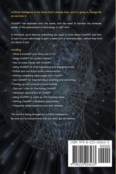 Artificial Intelligence is the future that's already here, and it's going to change everything! ChatGPT has exploded onto the scene, and the need to harness the immense power of this phenomenal AI technology is right now! In this book, you'll discover everything you need to know about ChatGPT and how to use it to your advantage and gain a head start on everyone else… before they find out about it too! Including:What is ChatGPT and What Can It Do? Using ChatGPT for content creation How to make money with ChatGPT Using ChatGPT to write interesting and engaging emails Fiction and non-fiction book outline creation Writing compelling sales pages with ChatGPT Use ChatGPT for inquiries about anything and everything Coming up with podcast scripts/outlines Tips and Tricks for fine-tuning ChatGPT Advanced Applications of ChatGPT Using ChatGPT to come up with business ideas Utilizing ChatGPT in Business Applications Frequently asked questions and their answers The world is being changed by Artificial Intelligence. Be sure you're onboard and that you don't get left behind.