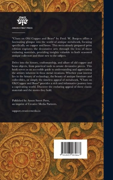 "Chats on Old Copper and Brass" by Fred. W. Burgess offers a fascinating glimpse into the world of antique metalwork, focusing specifically on copper and brass. This meticulously prepared print edition explores the decorative arts through the lens of these enduring materials, providing insights valuable to both seasoned antique collectors and those new to the subject. Delve into the history, craftsmanship, and allure of old copper and brass objects, from practical tools to ornate decorative pieces. This book serves as an accessible guide to understanding and appreciating the artistry inherent in these metal creations. Whether your interest lies in the history of technology, the beauty of antique furniture and collectibles, or simply the timeless appeal of metalwork, "Chats on Old Copper and Brass" provides a rich and informative journey into a captivating world. Discover the enduring appeal of these classic materials and the stories they hold. This work has been selected by scholars as being culturally important, and is part of the knowledge base of civilization as we know it. This work is in the public domain in the United States of America, and possibly other nations. Within the United States, you may freely copy and distribute this work, as no entity (individual or corporate) has a copyright on the body of the work. Scholars believe, and we concur, that this work is important enough to be preserved, reproduced, and made generally available to the public. We appreciate your support of the preservation process, and thank you for being an important part of keeping this knowledge alive and relevant.