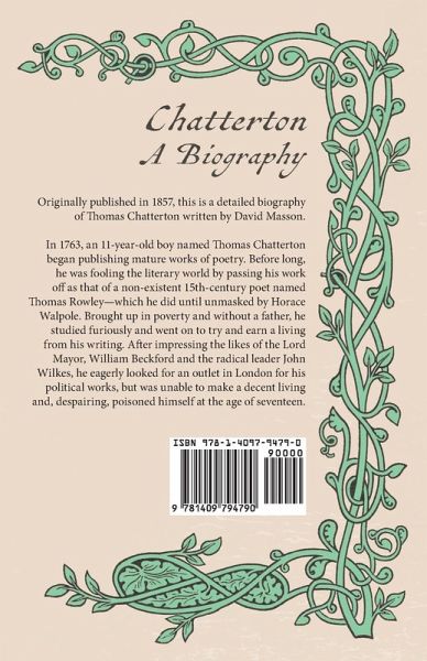 In 1763, an 11-year-old boy named Thomas Chatterton began publishing mature works of poetry. Before long, he was fooling the literary world by passing his work off as that of a non-existent 15th-century poet named Thomas Rowley-which he did until unmasked by Horace Walpole. Brought up in poverty and without a father, he studied furiously and went on to try and earn a living from his writing. After impressing the likes of the Lord Mayor, William Beckford and the radical leader John Wilkes, he eagerly looked for an outlet in London for his political works, but was unable to make a decent living and, despairing, poisoned himself at the age of seventeen. Chatterton had a significant impact on Romantic artists including Coleridge, Wordsworth, Shelley, and Keats; with numerous notable poems, plays, and paintings having been dedicated to him since his untimely death. Originally published in 1857, this book contains a detailed biography of Chatterton written by David Masson. Prof David Mather Masson (1822-1907) was a Scottish historian, literary critic historian, and academic who vocally supported women's suffrage. His most famous work is his magnum opus "Life of Milton in Connexion with the History of His Own Time" (1858-1880). Other notable works by this author include: "British Novelists and their Styles" (1859), "Drummond of Hawthornden" (1873), and "Edinburgh Sketches" (1892). Read & Co. is republishing this classic biography in a new edition complete with a biography by George Gregory Smith.
