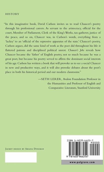 "In this imaginative book, David Carlson invites us to read Chaucer's poetry through his professional careers. As servant to the aristocracy, official for the court, Member of Parliament, Clerk of the King's Works, tax-gatherer, justice of the peace, and so on, Chaucer was, in Carlson's words, everything from a 'lackey' to an 'official of the repressive apparatus of the state.' Chaucer's poetry, Carlson argues, did the same kind of work as the poet did throughout his life: it flattered patrons and disciplined political unrest. Chaucer's Jobs reveals how Chaucer became the 'father' of English poetry, not so much because he was a great poet, but because his poetry served to affirm the dominant social interests of his age. Carlson has written a book that will provoke us to see a social Chaucer in new and productive ways, and it will also provoke debates about the poet's place in both his historical period and our modern classrooms." - Seth Lerer, Avalon Foundation Professor in the Humanities and Professor of English and Comparative Literature, Stanford University
