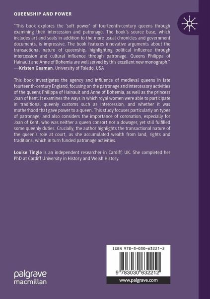 This book investigates the agency and influence of medieval queens in late fourteenth-century England, focusing on the patronage and intercessory activities of the queens Philippa of Hainault and Anne of Bohemia, as well as the princess Joan of Kent. It examines the ways in which royal women were able to participate in traditional queenly customs such as intercession, and whether it was motherhood that gave power to a queen. This study focuses particularly on types of patronage, and also considers the importance of coronation, especially for Joan of Kent, who was neither a queen consort nor a dowager, yet still fulfilled some queenly duties. Crucially, the author highlights the transactional nature of the queen's role at court, as she accumulated wealth from land, rights and traditions, which in turn funded patronage activities.